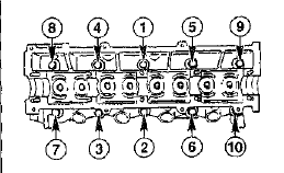 • Ослабить болты головки цилиндров по порядку с 10 до 1, затем затянуть их в несколько этапов в порядке с 1 по 10.