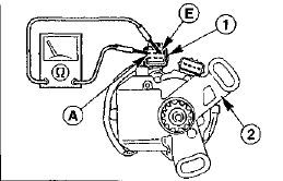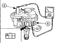 * Подключить омметр между клеммой А втулки -1- и клеммой высокого напряжения -3-. Измерить вторичное сопротивление и сравнить полученные данные с заданными параметрами. Правильное значение: 9,6-14,4 Ом (двигатель объемом 2,5 л: 11,5-18,5 Ом).