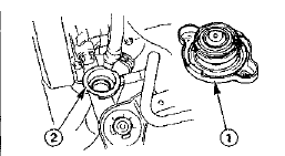 • Открыть крышку - 1 - радиатора -2-. При этом положить тряпку на крышку, немного надавить на крышку и повернуть ее влево.