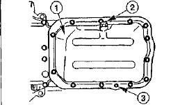 • Отвинтить болты крепления масляного поддона - 1 - . Удалить остатки герметика с резьбы болтов. 2 - резьбовая пробка маслосливного отверстия, 3 - сварная гайка.