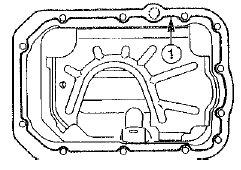 • Нанести силиконовую смазку - 1 - , например Loctite "Ultra Black", на уплотнительную поверхность масляного поддона. Наносить средство слоем в 2,0-3,0 мм по внутреннее стороне отверстий для болтов.