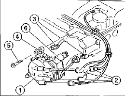 • Пометить маркером положение распределителя зажигания в головке цилиндров • Отвинтить болт -5- распределитель зажигания -4- и отсоединить от головки цилиндров.