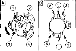 Ротор вращается против часовой стрелки (показано стрелкой). Цилиндры считаются в порядке от 1 до 4. Первый цилиндр находится на стороне клиновидного ремня. Кабель зажигания этого цилиндра, как правило, имеет цифру " 1 " , а штекер кабеля зажигания - цветную точку.