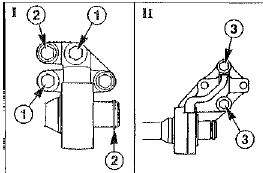 I - дизельные двигатели мощностью 75 л.с: сначала затянуть болты - 1 - (9 Нм), затем - болты -2- (45 Нм); II - дизельные двигателя мощностью 100 л.с: затянуть болты -3- (45 Нм).