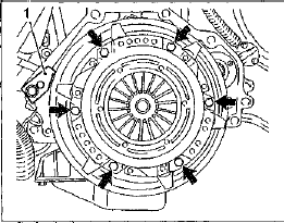 • Застопорить отверткой или спец. приспособлением - 1 - маховик. Открутить на 1 или 1 1/2 оборота винты крепления корзины сцепления (на рисунке винты показаны стрелками) и ослабить тем самым крепление корзины сцепления.