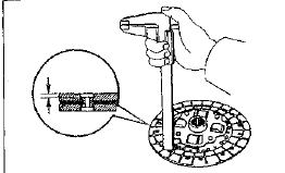 Измерить штангенциркулем расстояние между заклепкой и рабочей поверхностью фрикционной накладки. Если данное расстояние составляет менее 0,3 мм либо на поверхности ведомого диска присутствуют трещины, он подлежит замене.
