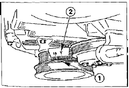 * Прокрутить коленчатый вал до тех пор, пока желтая маркировка - 1 - шкива не совпадет с маркировкой Т -2- на нижней крышке зубчатого ремня.