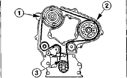 1 - маркировка распределительного вала 2 - маркировка ТНВД 3 - маркировка коленчатого вала На рисунке изображен дизельный двигатель мощностью 74 кВт (100 л.с.) • Отсоединить верхнюю крышку зубчатого ремня.
