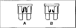 Отличительным признаком перегоревшего предохранителя являются расплавленные металлические полосы на его корпусе. А исправный предохранитель, В - перегоревший предохранитель.